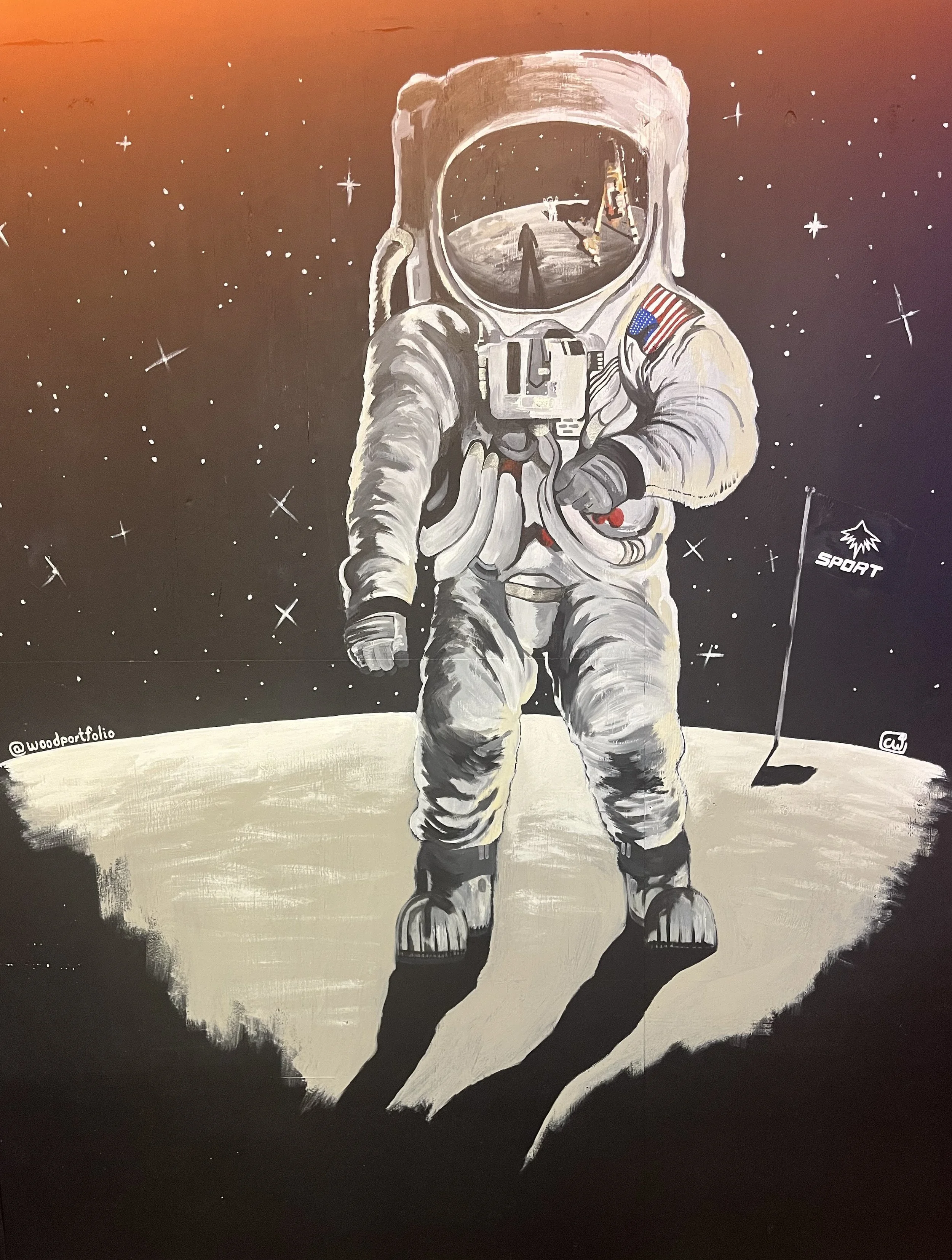 Print version of my 2023 acrylic paint mural Walking on the Moon. It is based on the 1969 photograph by Neil Armstrong of Buzz Aldrin walking on the surface of the Moon during the Apollo 11 mission. This mural was completed as the third in a series of space-centric murals for the Sport of Cheer gym in Austin.